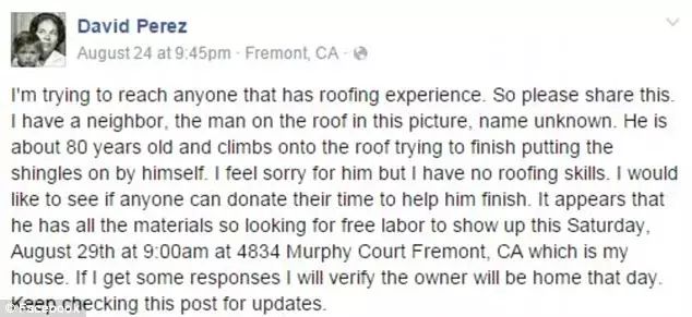 于是晚上回去David就在自己的Facebook上发了一条消息。大意就是他看到了邻居老人自己爬上房顶维修,希望帮他找到愿意志愿来帮忙的好心人。假如愿意的话就在周末的时候到他们家集合,他带他们过去。假如你有认识的人,请你帮忙转发一下。